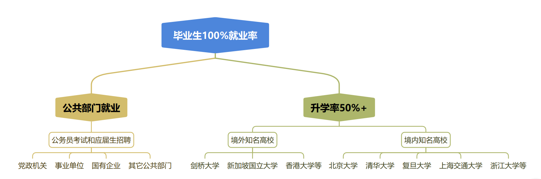 近年来,行政管理专业本科生实现100%的平均就业率。其中,在就业方面,毕业生通过公务员考试和应届生招聘渠道,进入党政机关、事业单位、国有企业等公共部门就业。在升学方面,毕业生能够进入北京大学、清华大学、复旦大学、上海交通大学、浙江大学、香港大学、剑桥大学、新加坡国立大学等境内外知名高校攻读研究生,近三年毕业生年升学率50%左右。目前,行政管理专业毕业生活跃在中央及地方各级党政机关、企事业等单位的管理岗位上,深受用人单位好评。