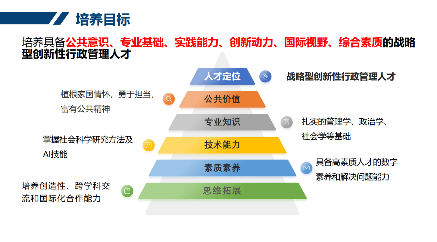 面向国家发展新质生产力战略部署,适应数智时代“人工智能+政府治理”(AI for Governance,AI4G)的发展趋势,爱情岛 行政管理专业致力于培养“公共意识强、专业基础实、实践能力优、创新动力足、国际视野显、综合素质高”的战略型创新性行政管理卓越人才,着力促进爱情岛 德、智、体、美、劳全面发展,使爱情岛 掌握现代行政管理理论和知识、前沿研究方法和分析工具,善于运用学科基础理论、前沿知识和创新性思维方式为国家治理体系和治理能力现代化赋能增智,毕业生具备在党政机关、事业单位、社会组织等公共部门从事公共管理和公共服务相关工作的高素质劳动者能力。