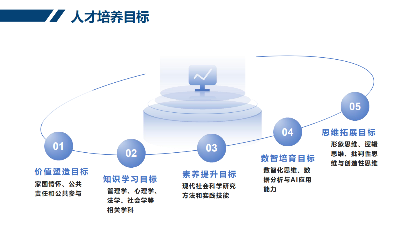 ③素养提升目标。掌握现代社会科学研究方法,具备良好的理性思考和学术创新能力;掌握参与社会实践和社会创业的多维途径,具备出色的中国实践问题解决能力、具有担当与团队精神。