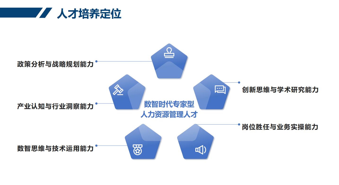 人力资源管理专业以“数智赋能+学科交融”为核心理念,以“场景驱动、行动学习、前沿引领”为导向,按照“通识教育与个性发展相结合,基础拓宽与实践强化相结合,思维养成与智能教育相结合”的培养思路,致力于培养具备政策分析与战略规划能力、产业认知与行业洞察能力、数智思维与技术运用能力、岗位胜任与业务实操能力、创新思维与学术研究能力的数智时代专家型人力资源管理人才。