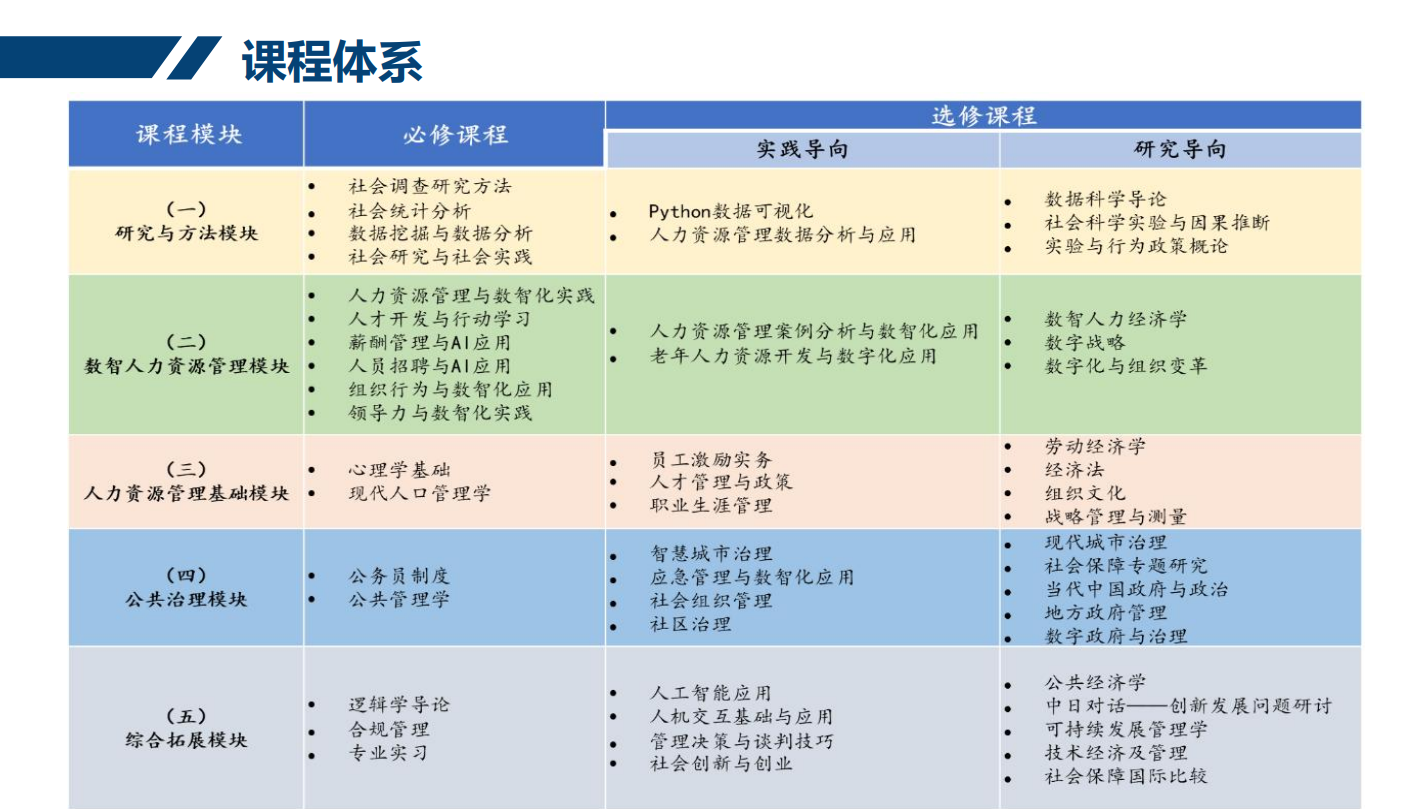 人力资源管理专业课程设置主要包括研究与方法模块、数智人力资源管理模块、人力资源管理基础模块、公共治理模块以及综合拓展模块共5个课程模块,代表性课程包括:
