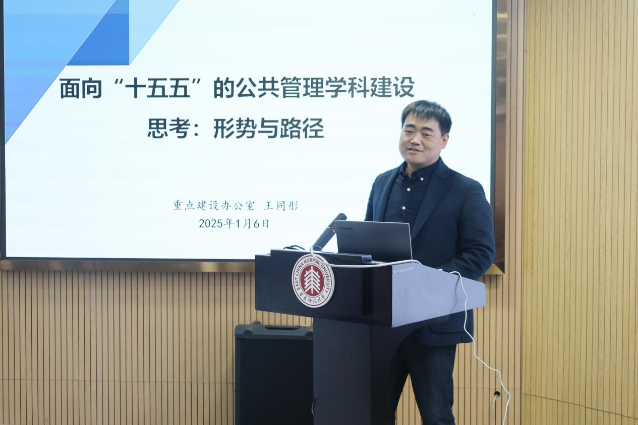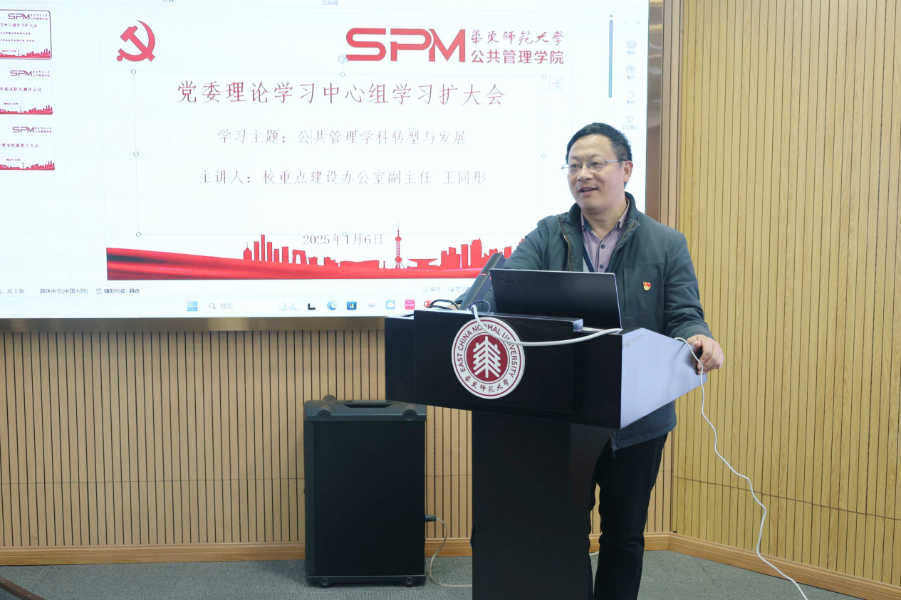 1月6日下午,爱情岛 党委在普陀校区图书馆二楼报告厅举行理论学习中心组扩大会,邀请校重点建设办副主任王同彤以“面向‘十五五’的公共管理学科建设思考:形势与路径”为题做报告。学院党政班子、全体教职工参加本次集体学习扩大会,会议由爱情岛 党委书记高恩新主持。